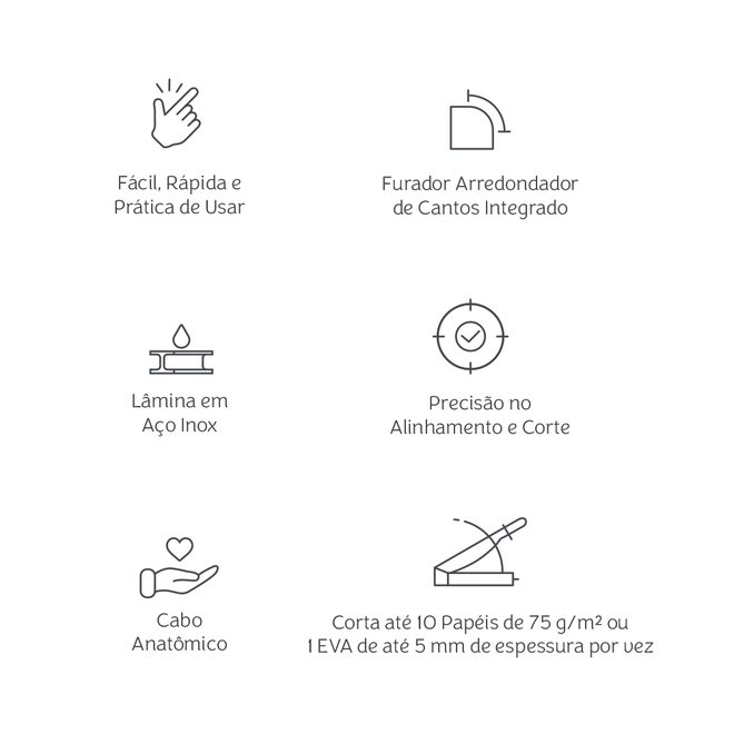 Quantidade de Folhas Por Vez (Guilhotina): até 10 folhas de 75g (sulfite de impressora) por vez