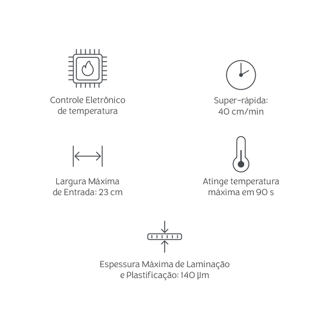 Nessa Laminadora Mimo, é possível usar papéis com gramaturas que variam de 125 g/m² a 300 g/m². Ela é compatível com a espessura máxima de laminação de 140 µm. Esse equipamento tem 360 W de potência, ou seja, tem o poder perfeito para deixar o seu trabalho ainda mais profissional!