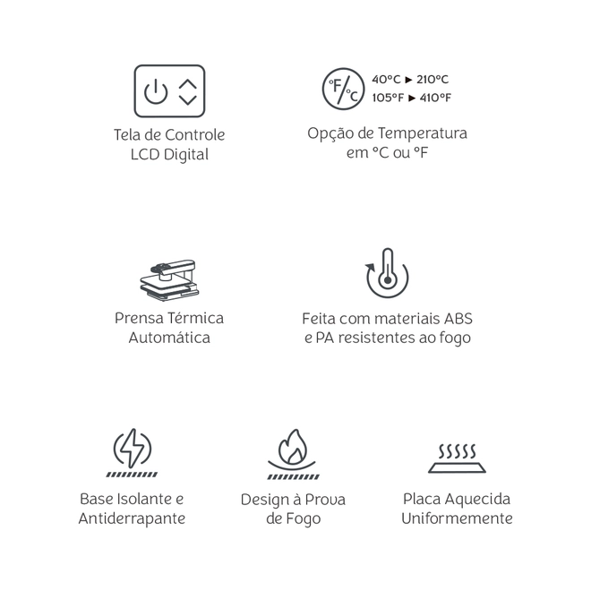Seu painel digital LCD oferece controle total de tempo, temperatura (em °C ou °F) e pressão, com ajustes precisos e função memória para repetir configurações com facilidade. A temperatura pode ser ajustada entre 40°C a 210°C (105°F a 410°F) e a pressão é regulável em kg ou lb, adaptando-se a diferentes tipos de materiais com eficiência e estabilidade.