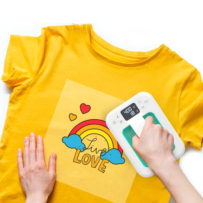 4 - Posicione o desenho onde quiser no material de base e coloque a prensa térmica sobre o desenho e inicie o cronômetro. Aplique pressão até que a máquina emita um bipe.