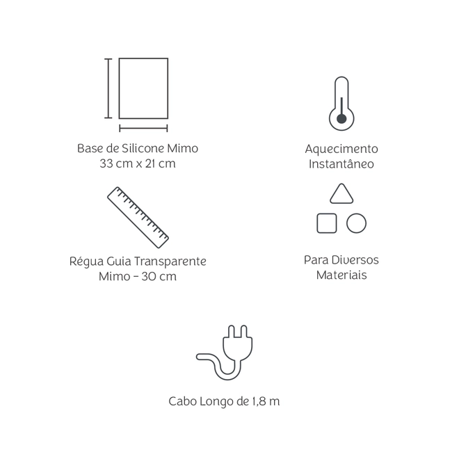 - Muito Mais Segurança! A Base de Silicone Mimo - A4 que acompanha a Mimo Sealing de fábrica tem 33 cm x 21 cm e resistente a altas temperaturas. Ela é recomendada para obter resultado ainda melhor e para proteger a superfície de trabalho de danos provocados pelo aquecimento durante o uso do selador ou de outras ferramentas que gerem calor. Seu design especial e antiderrapante possui guias de marcações em centímetros e polegas, que facilitam a precisão do posicionamento de materiais sobre ela.