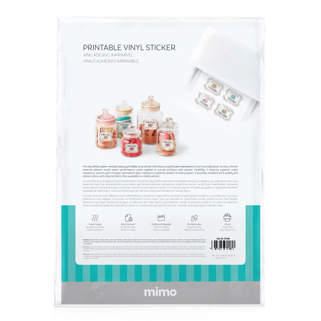 O Vinil Adesivo Imprimível Branco Brilho Resistente a Água - Mimo - A4 - 10 fls chegou para elevar o nível dos seus projetos personalizados. Essa nova versão traz um material ainda mais avançado, com desempenho superior em todos os detalhes: agora mais fino, flexível e com aderência ainda mais forte, ele se adapta com facilidade a superfícies curvas e irregulares, garantindo uma aplicação suave, limpa e duradoura.Produzido com tecnologia aprimorada, esse Vinil Adesivo Imprimível Mimo oferece resistência muito maior à água, tornando-se ideal para projetos decorativos que podem ter contato leve com umidade — como squeezes, embalagens, rótulos artesanais, planners, organização, brindes e muito mais.