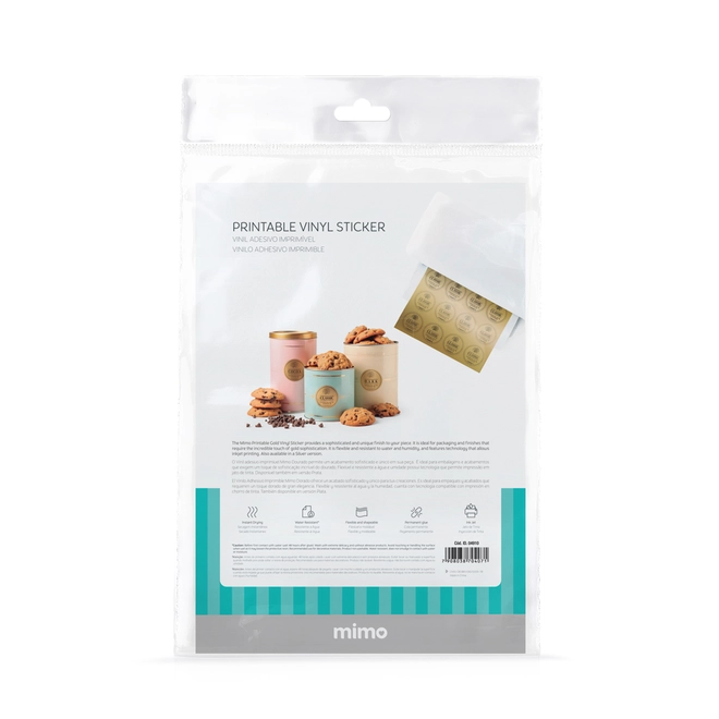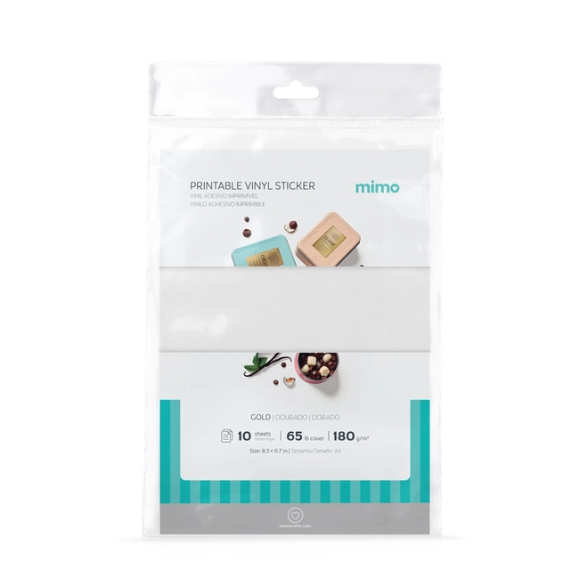 O Vinil Adesivo Imprimível Dourado Brilho Resistente a Água - Mimo - A4 10 fls 180g é um material adesivo de fabricação Premium que te permite fazer adesivos personalizados com muita sofisticação. Ele possui superfície brilhante na cor dourada. A embalagem do Adesivo Imprimível Mimo vem com 10 folhas no tamanho A4 e gramatura de 180 g/m².