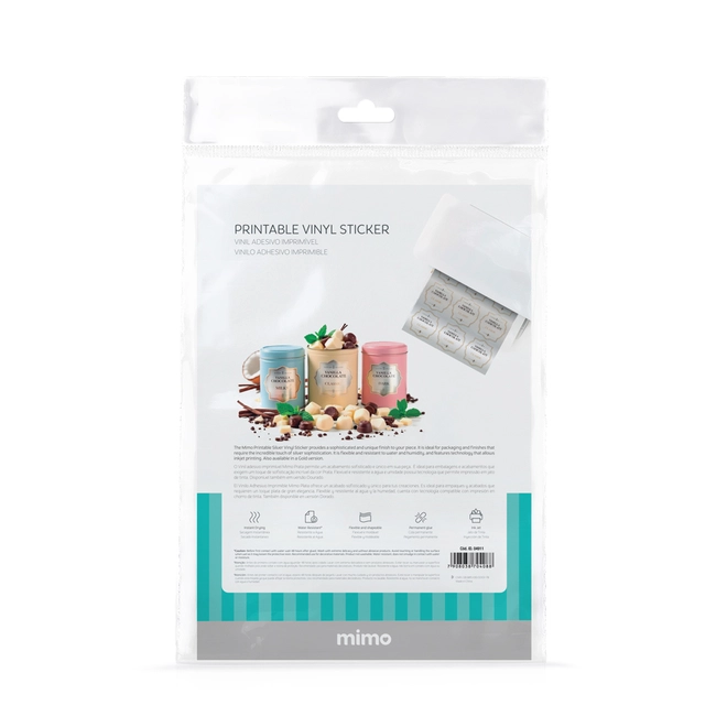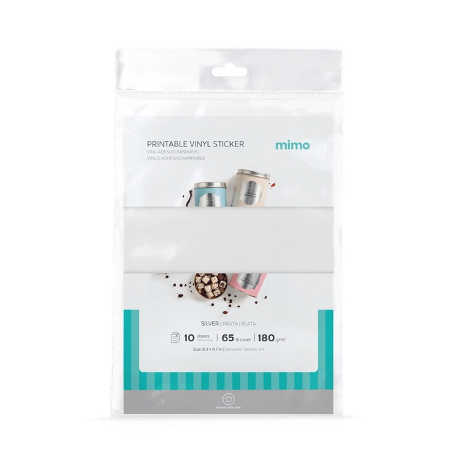 O Vinil Adesivo Imprimível Prata Brilho Resistente a Água- Mimo - A4 10fls 180g é um material adesivo de fabricação Premium que te permite fazer adesivos personalizados com muita sofisticação. Ele possui superfície brilhante na cor prata. A embalagem do Vinil Adesivo Imprimível Mimo vem com 10 folhas no tamanho A4 e gramatura de 180 g/m².